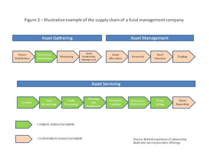 The level of disaggregation of the investment management supply chain partly depends upon the region of the world that we consider. In general, it is accepted that the US is most advanced in the use of outsourcing, followed by both Europe and the Middle East with Asia the least developed. Therefore it is not easy to give a one model fits all. However, Figure 3 shows how the functions of a new investment management company could be practically sourced today. The definition of sourced used for Figure 3 is that the fund manager can ask a separate company, not linked to the fund manager to actually undertake the activity (rather than just provide the technology platform).